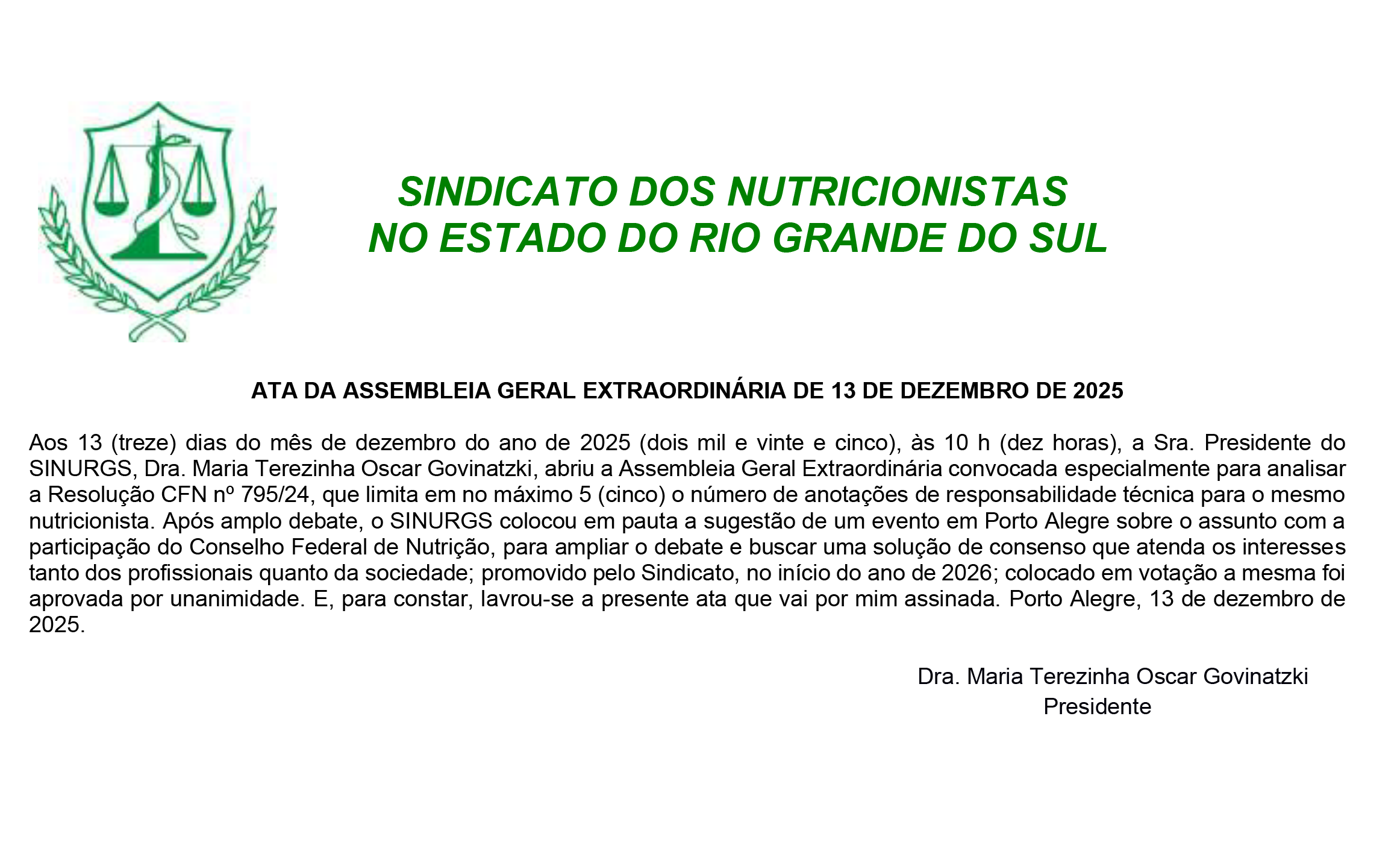 Aos 13 (treze) dias do mês de dezembro do ano de 2025 (dois mil e vinte e cinco), às 10 h (dez horas), a Sra. Presidente do SINURGS, Dra. Maria Terezinha Oscar Govinatzki, abriu a Assembleia Geral Extraordinária convocada especialmente para analisar a Resolução CFN nº 795/24, que limita em no máximo 5 (cinco) o número de anotações de responsabilidade técnica para o mesmo nutricionista. Após amplo debate, o SINURGS colocou em pauta a sugestão de um evento em Porto Alegre sobre o assunto com a participação do Conselho Federal de Nutrição, para ampliar o debate e buscar uma solução de consenso que atenda os interesses tanto dos profissionais quanto da sociedade; promovido pelo Sindicato, no início do ano de 2026; colocado em votação a mesma foi aprovada por unanimidade. E, para constar, lavrou-se a presente ata que vai por mim assinada. Porto Alegre, 13 de dezembro de 2025.