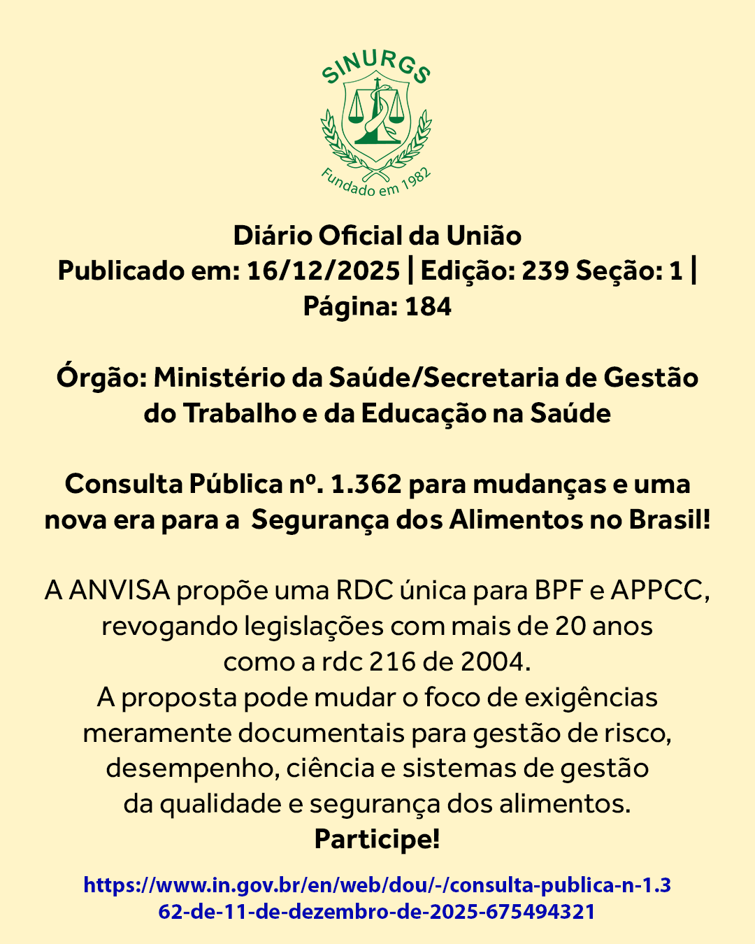 Consulta Pública n?. 1.362 para mudanças e uma nova era para a Segurança dos Alimentos no Brasil!